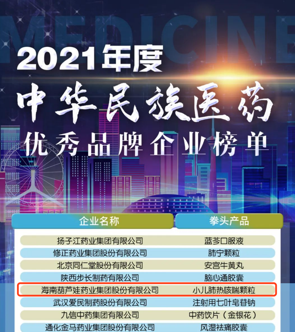 12月29日,全国工商联医药业商会发布了“2021年度中华民族医药优秀品牌企业榜单”,利来w66药业集团凭借黄金单品小儿肺热咳喘颗粒(4克)实力登榜。